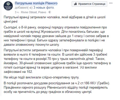Патрульные города Ровно задержали 30-летнего мужчину, который отбирал у первоклашек в школе ценные вещи. Об этом полиция сообщает в Facebook.