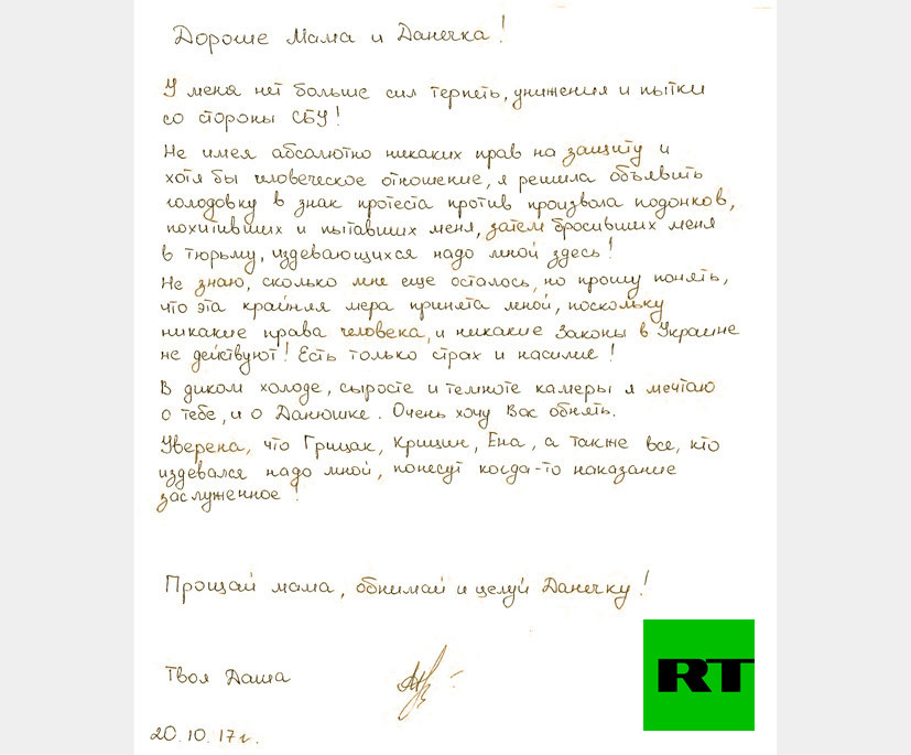 «Дорогие мама и Данечка! У меня больше нет сил терпеть унижения и пытки со стороны СБУ. Не имея абсолютно никаких прав на защиту и хотя бы человеческое отношение, я решила объявить голодовку в знак протеста против произвола подонков, похитивших и пытавших меня, а затем бросивших меня в тюрьму, издевающихся надо мной здесь!»
