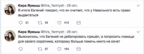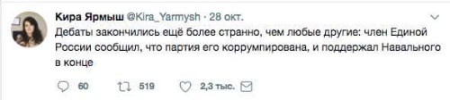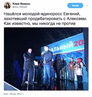 По дороге лжи идут и работнички Алексея Навального, которые, видимо, то же считают нормой предоставлять общественности недостоверную информацию, которую, причем, можно проверить. В октябре в Курске проходил митинг сторонников Навального, в ходе которого пресс-секретарь оппозиционера Кира Ярмыш разместила в своем twitter-аккаунте запись о том, что член «Единой России» вышел на сцену, чтобы продебатировать с Навальным.