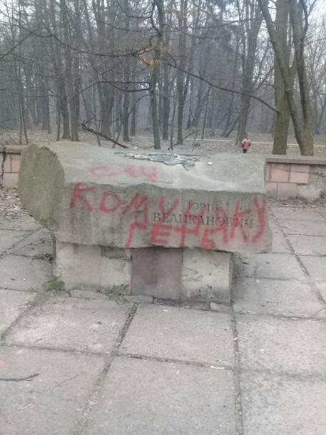 "На улице Мишуги, 30 возле парка Железная вода, неизвестные повредили памятник: написали красной краской на постаменте «Коммуняку геть», а саму фигуру сбросили на землю", – говорится в сообщении.