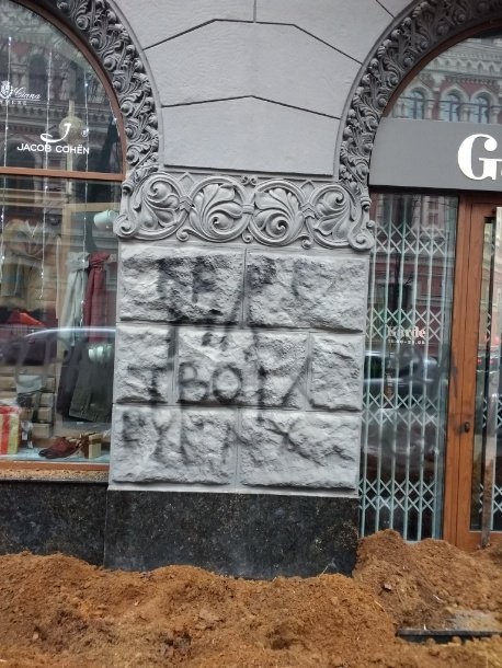 Также на стене здания неизвестные написали, что руки владельца бутика "в крови", а его место за решеткой.