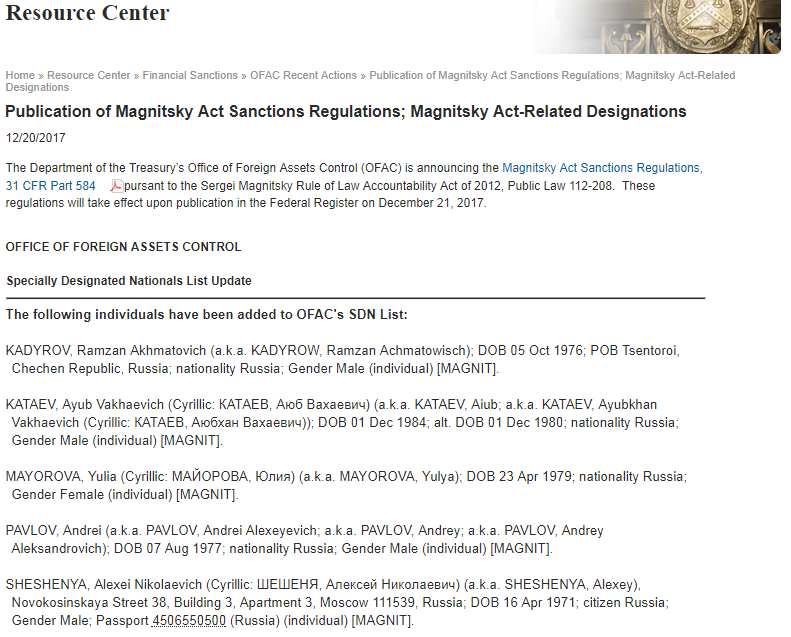 США внесли в санкционный "список Магнитского" пятерых россиян, включая главу Чечни Рамзана Кадырова, сообщает американское Министерство финансов.