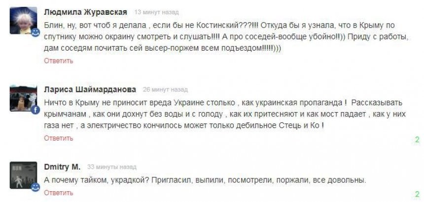 Стоит отметить, что сами жители полуострова отнеслись к призыву Костинского с иронией. В частности, они напомнили, что даже во время принадлежности региона к Украине крымчане без особого желания смотрели украинское телевидение, а сейчас и вовсе не могут терпеть пропаганду Киева. Пользователи социальных сетей отметили, что новости из Украины можно смотреть только ради смеха.