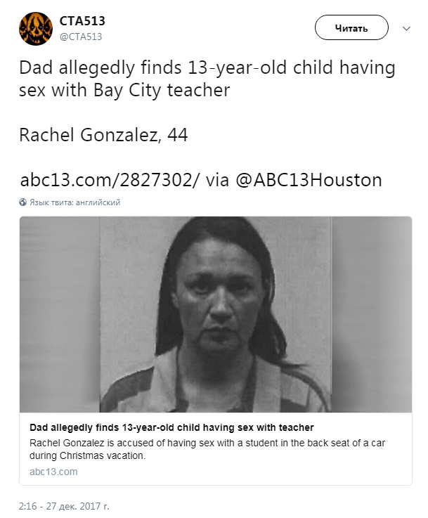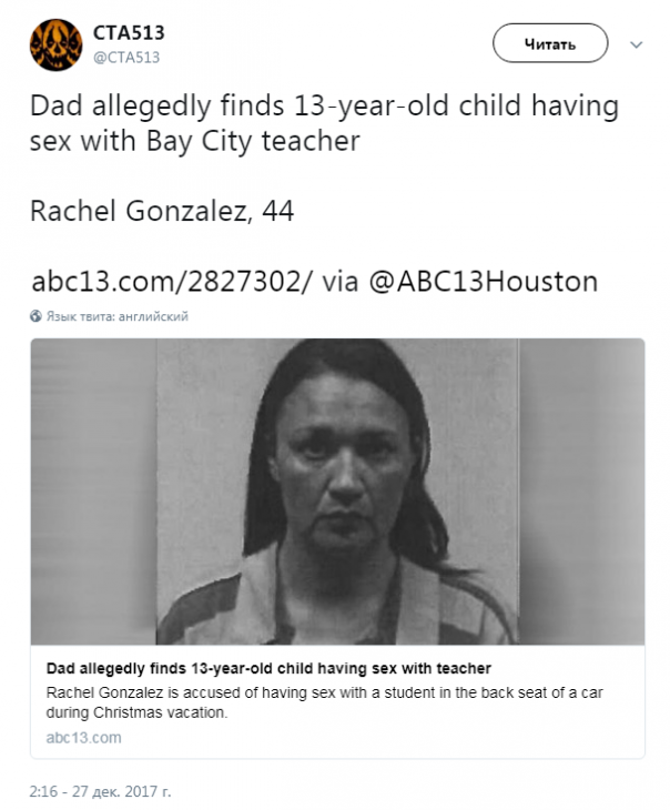 В Техасе 44-летняя учительница занялась сексом со своим 13-летним учеником. Об этом сообщили в полиции штата.