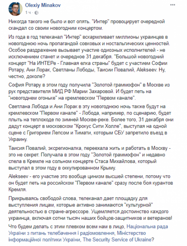 Не так давно популярный украинский блогер Алексей Минаков на своей странице в Facebook сообщил, что якобы телеканал «Интер» делает все, чтобы испортить новогодние праздники гражданам страны и спровоцировать громкий скандал. В частности, его не устроил список артистов, приглашенных каналом на новогодний концерт. По мнению блогера, «Интер» решил собрать одних «предателей»: исполнителей, которые продолжают свои гастроли по России.