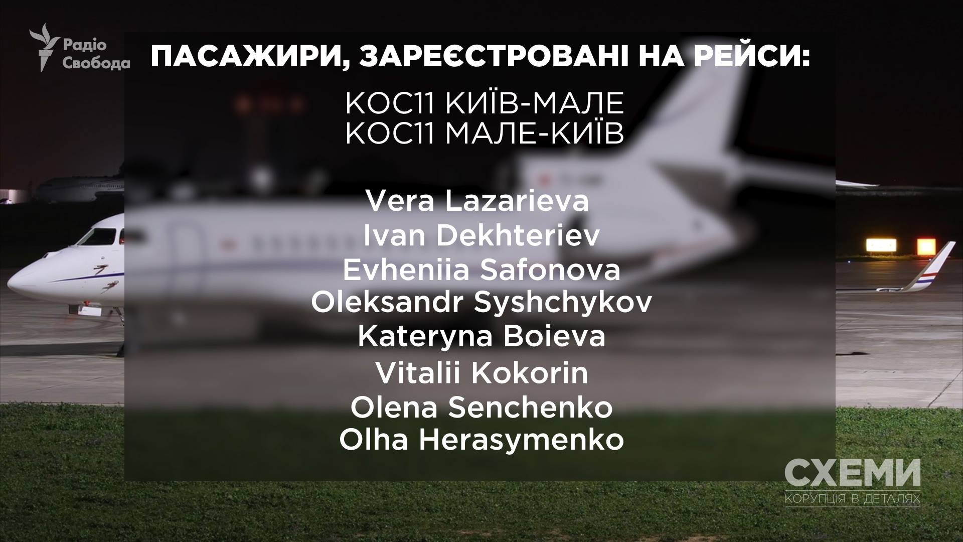 Из Киева на Мальдивы 1 января вылетел чартер, на котором были зарегистрированы пассажиры: Вера Лазарева, Иван Дегтерев, Евгения Сафонова, Александр Сычников, Катерина Боева, Виталий Кокорин, Елена Сенченко, Ольга Герасименко.