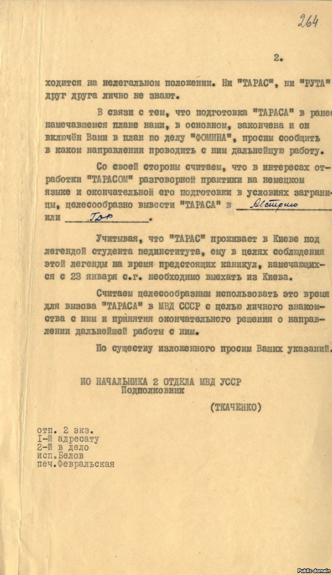 МГБ отслеживает и личную переписку «Тараса». Так, из писем Богдана Сташинского к родителям видно, что он убеждает их не поддерживать «самостийну» и подполье. Иначе, как пишет Сташинский, он уже второй раз не сможет спасти родных от «тюрьмы».
