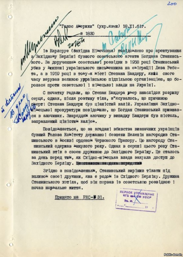Материалы дела агента МГБ-КГБ Богдана Сташинского («Олега-Тараса»), который 15 октября 1959 года из специального пистолета выстрелил струей раствора цианистого калия в лицо Степану Бандере, теперь доступны всем пользователям интернета.