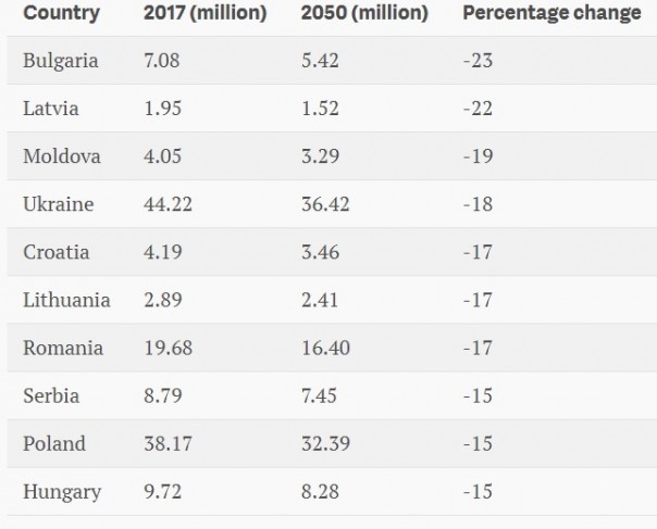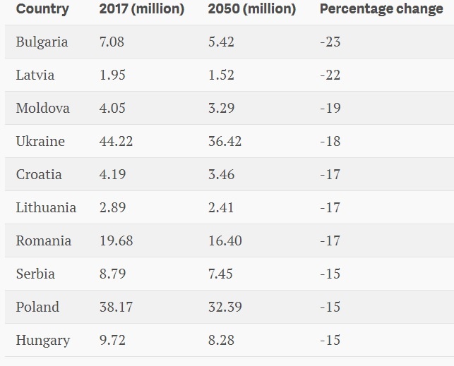 По их мнению, в течение следующих нескольких десятилетий Восточная Европа резко сократится. Среди названных факторов, влияющих на уменьшение населения, - миграция в более богатые и благополучные страны, снижение рождаемости и повышение смертности.