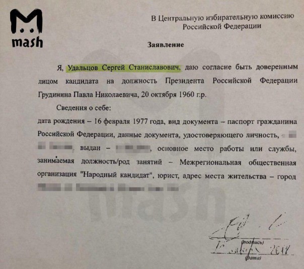 В соцсетях опубликовали заявление лидера «Левого Фронта» Сергея Удальцова о том, что он дает согласие «быть доверенным лицом кандидата на должность президента РФ» Павла Грудинина. Авторы анонимного телеграм-канала «Mash» выложили копию документа, и прокомментировали: