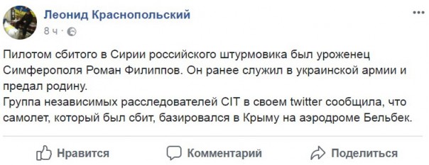 «Лёня из Донецка стучал в СБУ на окружающих, угрожал мне лично, снимал и передавал передвижение ополчения, пока его не «приняли»… Отпустили и даже пальцем никто не трогал. Никакие российские военные с ним, конечно не беседовали… Выехав в Днепропетровск, начал помогать карательным зондеркомандам… Вчера ещё радовался гибели русского лётчика. Жаль, я так хотел с ним встретиться. Ну, Господь сам управил», – пишет депутат. Источник