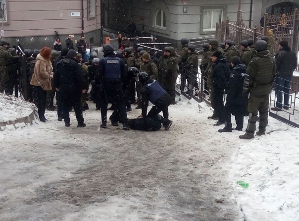 Под зданием Соломенского райсуда в Киеве, где слушается дело об избрании меры пресечения мэру Одессы Геннадию Труханову, произошла стычка националистических боевиков с нацгвардейцами, охраняюшими суд.