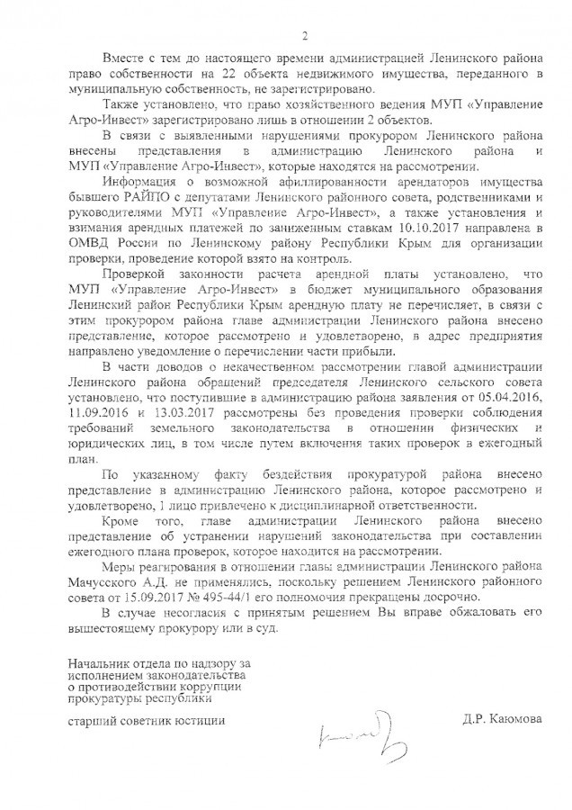 Кроме того, по факту бездействия на обращения председателя Ленинского сельского совета один работник районной администрации был привлечен к дисциплинарной ответственности, а главе администрации Ленинского района внесено представление об устранении нарушений законодательства при составлении ежегодного плана проверок.