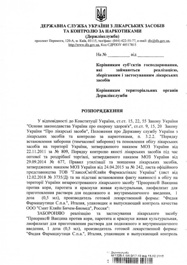 В документе говорится о том, что партия вакцины запрещена на основании "установление факта наличия в обращении на территории Украины незарегистрированного лекарственного средства".