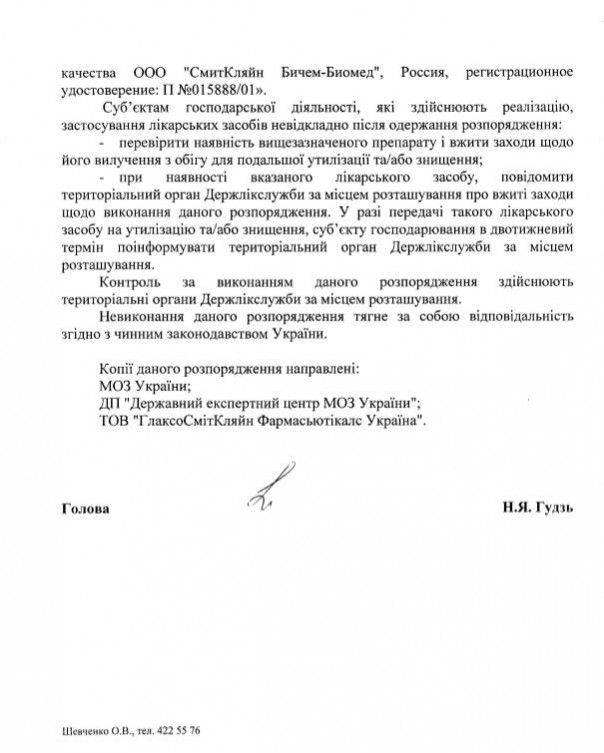 МОЗ поручил реализаторам вакцины изъять ее из обращения для дальнейшей утилизации или уничтожения. Источник