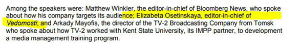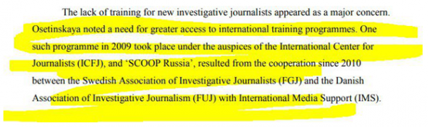 Важно отметить, что Осетинская никогда не отрицала того, что она сама, как и сотрудники её издания, принимала участие в различных «обучающих» программах, инициированных западными НКО. Очевидно, что на подобных мероприятиях российскую журналистку учили, как манипулировать общественным мнением в интересах хозяев, подающих ей монетку на обед. В частности, «Ведомости» тесно сотрудничали с International Center for Journalists и International Media Support (обе организации спонсируются западными МИД).