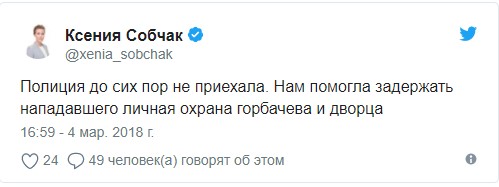 На кандидата в президенты России Ксению Собчак напал некий мужчина. Об этом сама она сообщила в Twitter. Инцидент произошел в центре Москвы в ходе мероприятия, посвященного 87-летию бывшего президента СССР Михаила Горбачева.