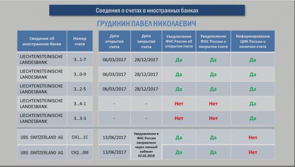 Судя по тем документам, которые оказались в распоряжении Лайфа, Грудинин в очередной раз ввёл в заблуждение Центризбирком. Ещё в конце прошлого года, когда кандидат подавал в ЦИК данные о собственности и доходах, в них не было ни одного слова о наличии средств в заграничных банках. В начале января Грудинин принёс в ЦИК новые данные. В этих документах он отметил, что у него было пять счетов: два в Швейцарии и три в австрийском филиале "Лихтенштейн ландесбанк АГ".