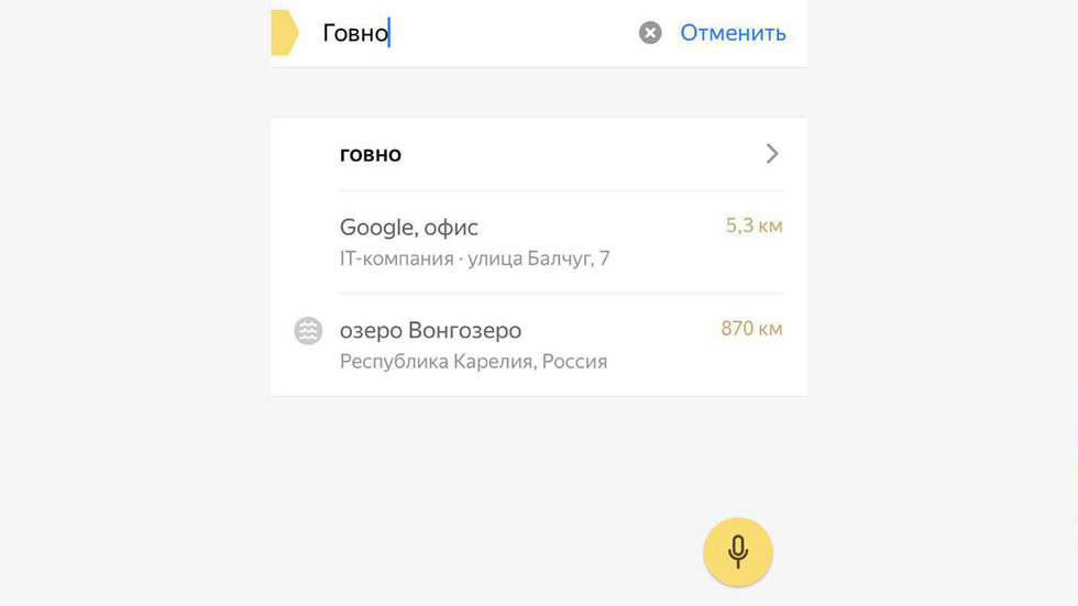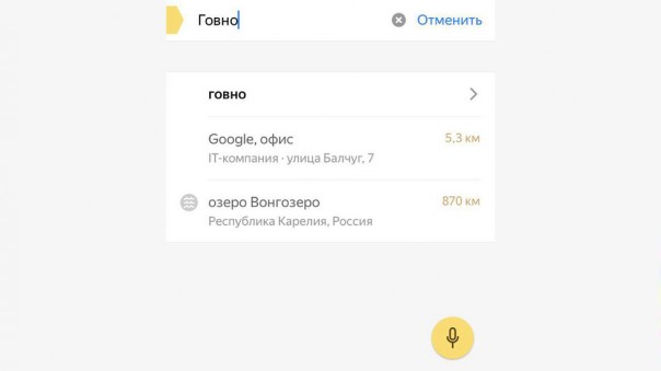 Пользователи Сети обнаружили "скрытое послание" от компании "Яндекс" своему конкуренту Google. При попытке ввести слово "говно" в картографическом сервисе "Яндекс.Карты" первым в списке появляется адрес московского офиса Google.