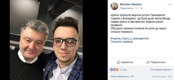 Пикантности состоявшейся встрече добавляет даже не то обстоятельство, что Петр Порошенко лично раздает указания платным блогерам из пула президентской алминистрации, как правильно освещать события текущей политики, а то, что он публично обнимается и фотографируется с человеком, который, по утверждению украинских медийщиков, является администратором одиозного стукаческого сайта “Миротворец”. Так, известный блогер Максим Равреба называет Мирослава Олешко “админом “Миротворца”.