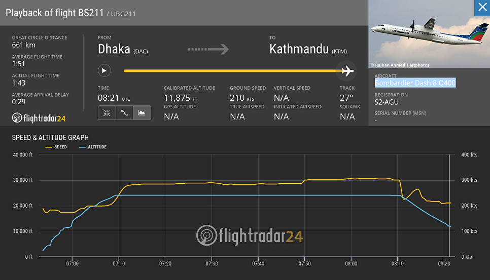 По данным издания, бортовой номер самолета — S2-AGU. Во время захода на посадку он не попал на взлетно-посадочную полосу, а вместо этого упал на футбольное поле к востоку от аэропорта.