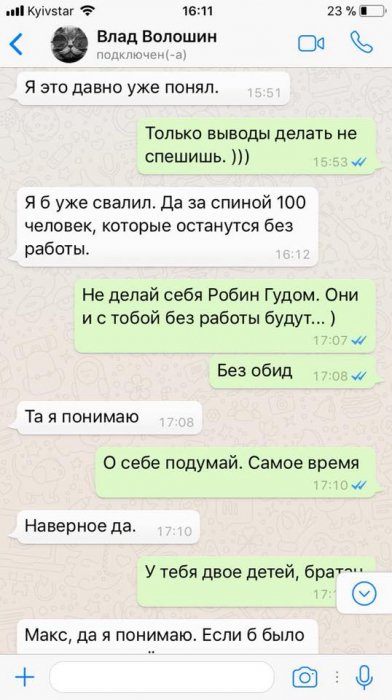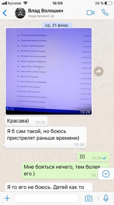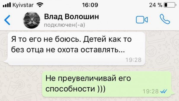 Общение между двумя людьми проходило в бесплатной системе мгновенного обмена сообщениями WhatsApp. С кем именно общался Волошин – неизвестно, но своего собеседника он назвал Макс. В конце переписки лётчик пишет, что не боится «его», но неохота детей оставлять без отца. В ответ он получает сообщение, чтобы не преувеличивал возможности «его». О ком идет речь и кого не должен был бояться Владислав Волошин – неизвестно.
