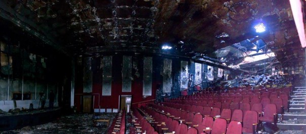 С улицы видно, как из вентиляционных шахт у крыши здания вновь идет густой черный дым.