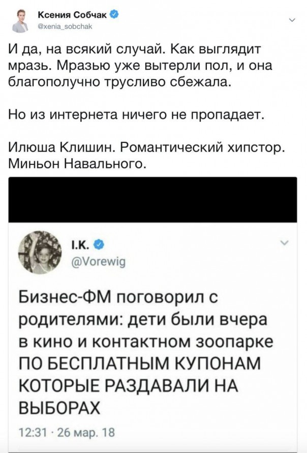 Известная телеведущая и политик Ксения Собчак в своём "твиттере" обратила внимание на пост диджитал-директора телеканала RTVI и сторонника Навального Ильи Клишина, который распространяет в Сети информацию о том, что дети, погибшие в ходе пожара в кемеровском торговом центре "Зимняя вишня", посещали контактный зоопарк и кинотеатр якобы по бесплатным купонам, выданным на избирательных участках. Собчак в свою очередь дала Клишину нелицеприятную личностную оценку, указав на то, что Клишин удалил фейк со своих страниц в соцсетях.