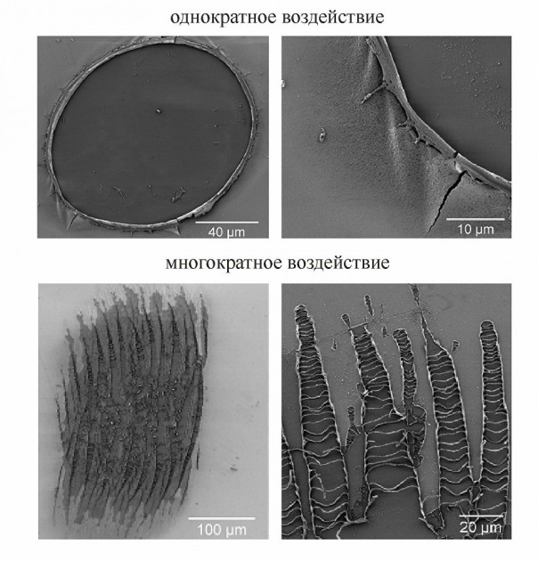 "Мы обнаружили очень удивительный эффект. При большом количестве импульсов с мощностью ниже пороговой появляется разрушение странного, необычного типа. Объяснить его пока не удается, но, по крайней мере, механизм инициирования его мы предположили. Как мы считаем, это происходит из-за электрострикции, увеличения объема материала под действием электрического поля", — отмечает физик.