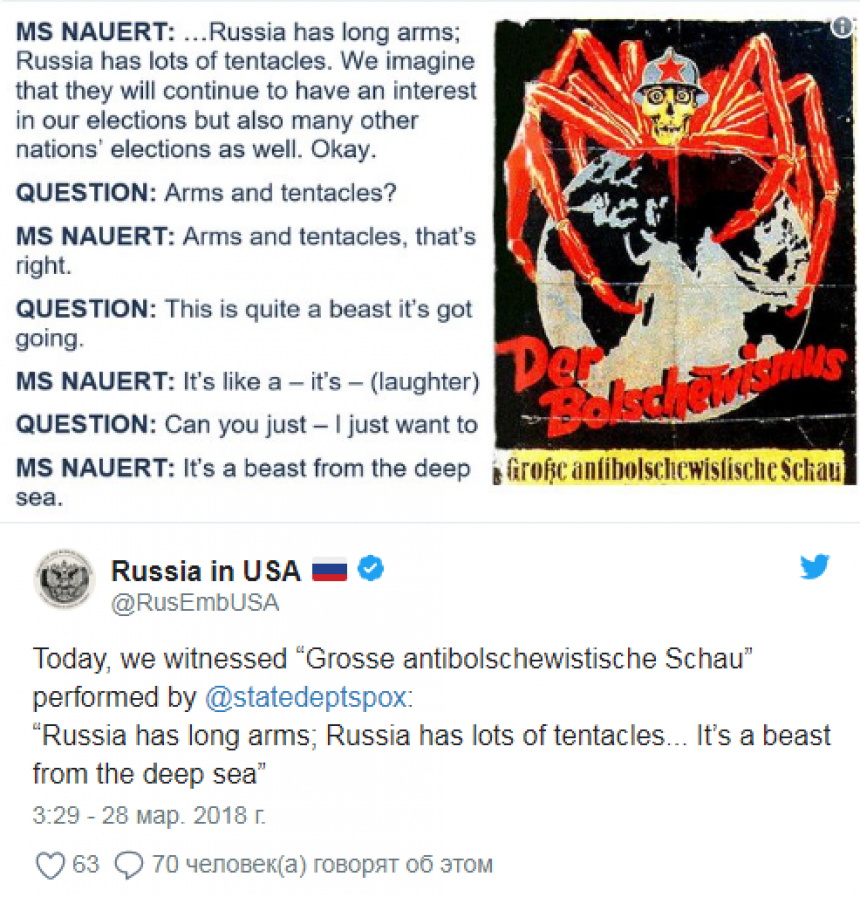 Реакция из России на ее слова не заставила себя ждать. Посольство РФ в США отметило, что дипломаты пользуются методами, схожими с немецкой пропагандой 1930-х годов.