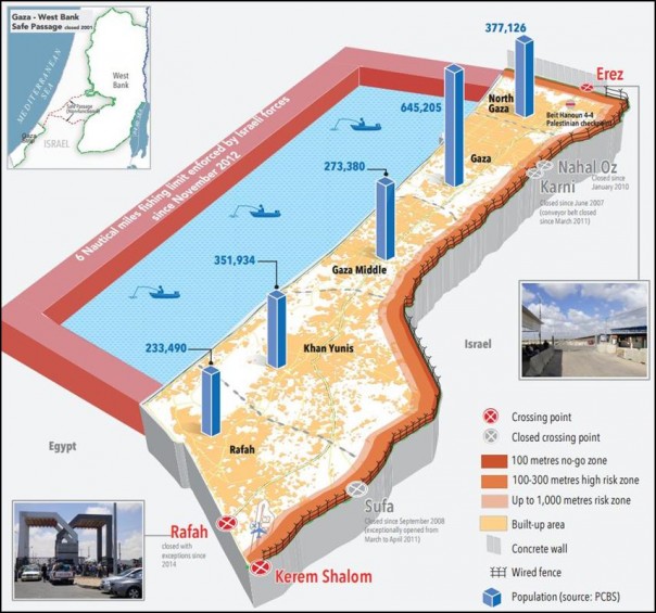 Израильский забор вокруг сектора Газа имеет трёхступенчатую зону отчуждения, нарушение которой грозит потерей жизни. Официальная зона запретного доступа составляет 100 метров, от 100 до 300 метров - зона повышенного риска, от 300 до 1000 метров - зона риска. Путём нехитрых расчётов узнаём, что полоса отчуждения конфискует 51 кв. км или около 14% площади сектора. Для того чтобы сдержать развитие анклава или осложнить и без того тягчайшую гуманитарную обстановку, в любой момент можно увеличить запретную зону ещё не несколько сотен метров, доведя тем самым неиспользуемые земли до 20% и более.