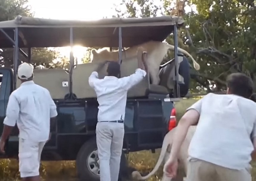 Лев запрыгнул в джип к туристам во время сафари и напугал их. На видео, снятое в национальном парке Крюгера в Южно-Африканской Республике обратило внимание издание Daily Mail.