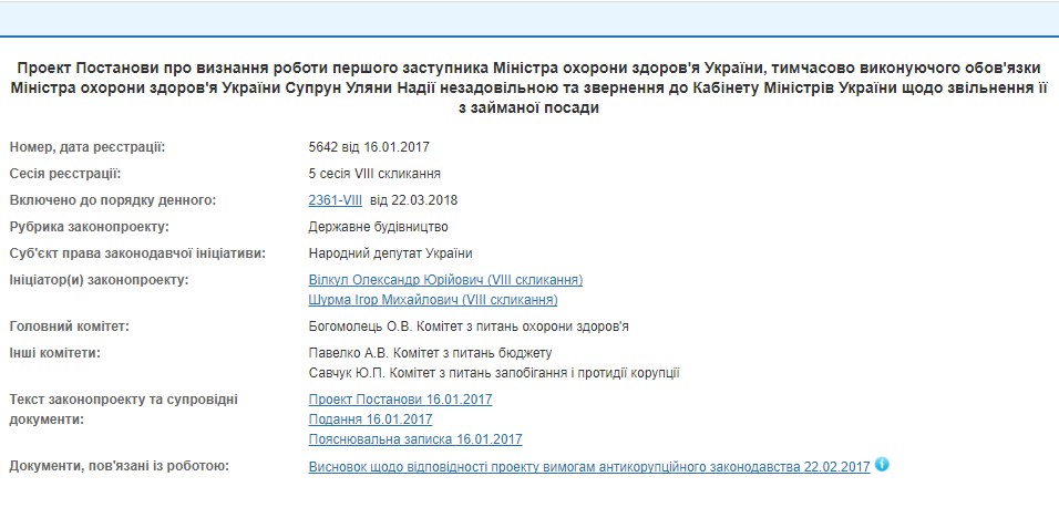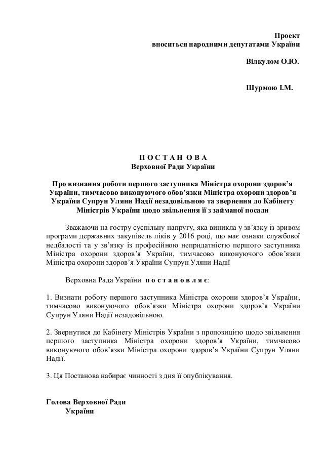 В Верховной Раде Украины зарегистрировали проект постановления об увольнении и.о. министра Здравоохранения Ульяны Супрун. Авторами документа выступили два народных депутата от Оппозиционного блока. Инициативу уже поддержал профильный комитет.