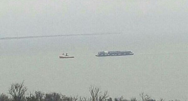 Большую морскую баржу с совершенно непонятным грузом сфотографировали жители Керчи. Мощный буксир и баржа шли по Керченскому проливу, направляясь в сторону строящегося моста.