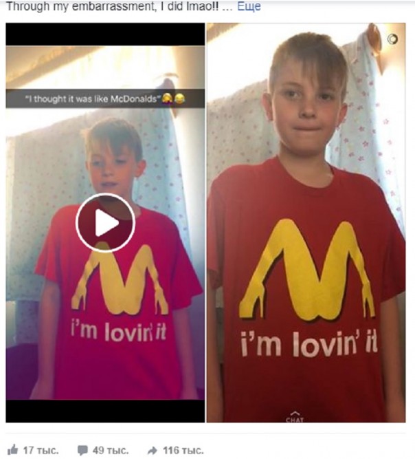 Третье место. Шелли Маккулар очень торопилась с утра, поэтому разрешила своему сыну Энтони выбрать любую одежду для школы. Мальчику приглянулась красная футболка с логотипом "Макдоналдса" и лозунгом компании I'm loving it, пишет Mirror. Видимо, сам Энтони тоже торопился на занятия, так как не соизволил развернуть футболку до конца или хотя бы посмотреть в зеркало перед выходом. Принт на футболке действительно похож на знаменитую золотую букву "М", только на конце её оказались женские каблуки, благодаря чему рисунок стал явно уж не для детей. Учителя возмутились внешним видом Энтони и сообщили об этом Шелли. Ей стало жутко неудобно, и в своём "фейсбуке" она решила извиниться публично перед всей школой. Дикие люди! Вопрос ведь совсем не в том, что мальчик пришел в подобном «прикиде» в школу. Вопрос в том, откуда вообще взялась подобная футболка в гардеробе ребенка?