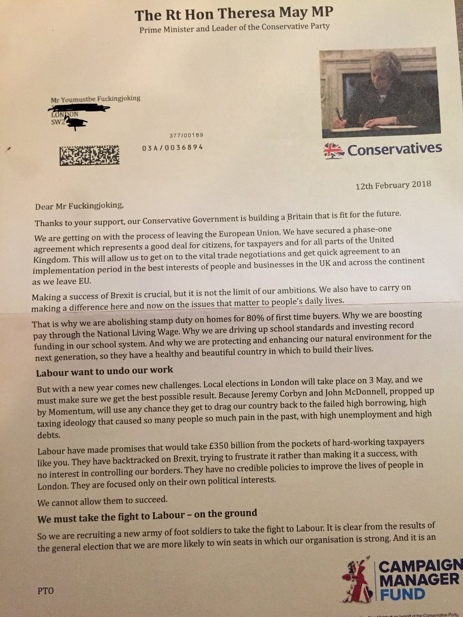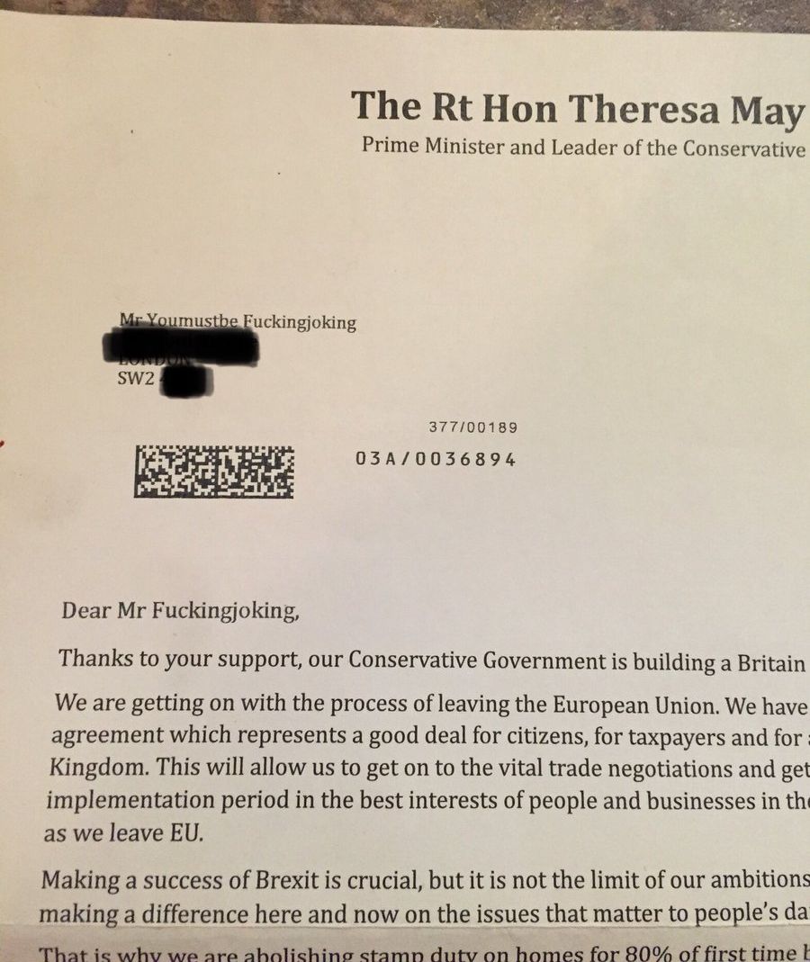 В письме, под которым стоит подпись премьер-министра Великобритании, к пожилому англичанину обращаются мистер Youmustbe Fuckingjoking.