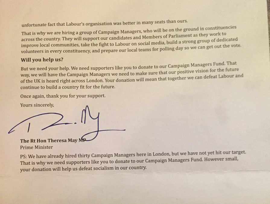 Письмо было подписано Терезой Мэй, премьер-министром Великобритании и лидером консерваторов.