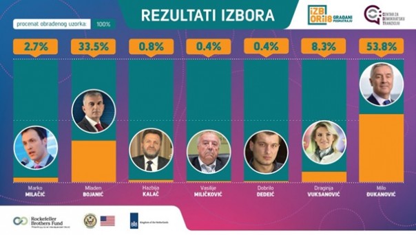 После подсчета 98,8% бюллетеней Джуканович, который выступает за вступление Черногории в Европейский союз, получил почти 54%. Это значит,что второй тур выборов не понадобится.