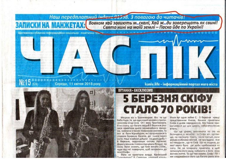Каневская газета “Час пик” вышла с праздничным лозунгом: “Волком пусть завоют москали, а жиды заверещат как свиньи! Нынче праздник на моей земле! – Пасха идет по Украине!”.