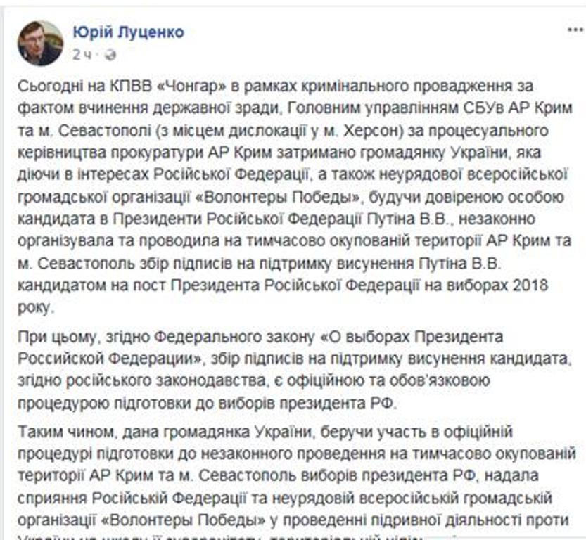 “Сегодня на КПВВ “Чонгар” в рамках уголовного производства по факту совершения государственной измены, Главным управлением СБУ в АР Крым и г. Севастополе(с местом дислокации в г. Херсон) при процессуальном руководстве прокуратуры АР Крым была задержана гражданка Украины, которая действуя в интересах Российской Федерации, а также неправительственной всероссийской общественной организации “Волонтеры Победы”, будучи доверенным лицом кандидата в президенты Российской Федерации Путина В.В., незаконно организовала и проводила на временно оккупированной территории АР Крым и г. Севастополь сбор подписей в поддержку выдвижения Путина В.В. кандидатом на пост президента Российской Федерации на выборах 2018 года”, – написал Луценко.