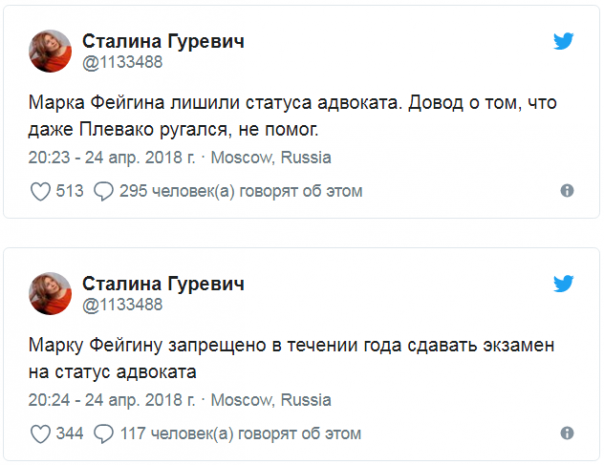 «Марка Фейгина лишили статуса адвоката. Довод о том, что даже Плевако ругался, не помог… Марку Фейгину запрещено в течении года сдавать экзамен на статус адвоката», — написала Гуревич.