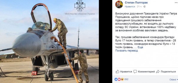 "Выполняя поручение Президента Украины Петра Порошенко, только что подписал приказ о повышении денежного довольствия военнослужащим, входящих в летный состав ВС Украины, установив 100% надбавку за выполнение особо важных заданий", - написал он.