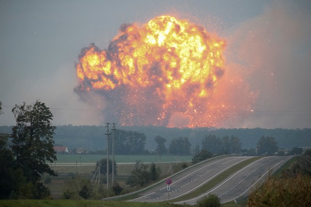 Генеральный штаб Вооруженных сил Украины (ВСУ) сообщил, что территория арсенала в Балаклее задымлена, наблюдаются взрывы низкой интенсивности, однако на место происшествия были направлены пожарный самолет Ан-32 и вертолет Ми-8.