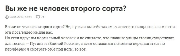 В своём восьмиминутном выступлении на сцене Навальный накачивал толпу и подсовывал людям идею о необходимости обязательно поддержать его провокацию на Тверской 5 мая. Типичные, примитивнейшие майданные технологии. Иными словами, Алексей политизировал изначально аполитичную акцию.