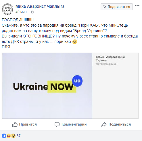 "Скажите, а что это за пародия на бренд "Порн ХАБ", что МинСтець родил нам на нашу голову под видом "Бренд Украины"?", - отметил Миха Чаплыга.