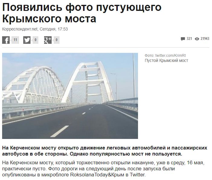 У них есть даже фотофакт подтверждения - Россия построила ещё один бесполезный мост (по версии либерастов и укров первым был на остров Русский на Дальнем Востоке)
