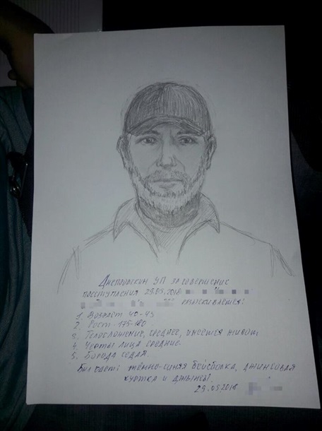 На фотороботе указано, что возраст подозреваемого 40-45 лет, рост 175-180 см, среднего телосложения. Имеет седую бороду. Был одет в темно-синюю бейсболку, джинсовую куртку и джинсы.