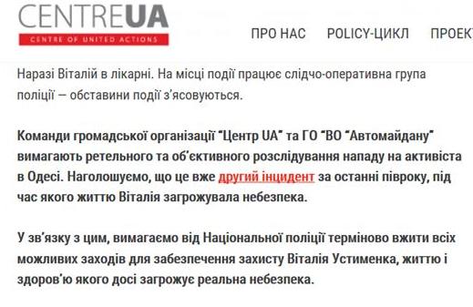 “Мы вышли с другом из редакции «Общественного телевидения» и через 10 метров сзади на меня напали двое мужчин спортивной внешности, они нанесли несколько ударов, повалили на землю и, по всей видимости ножом, или чем то острым нанесли удар по почке, так как в районе почки у меня колотая рана. Я не знаю нападающих”, – позже заявил сам Устименко.