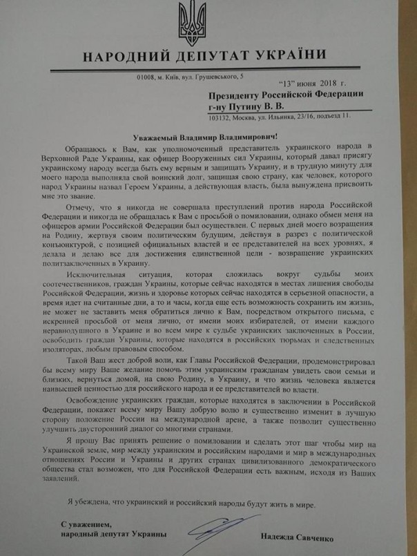 В письме Савченко утверждает, что "никогда не совершала преступлений против народа Российской Федерации".