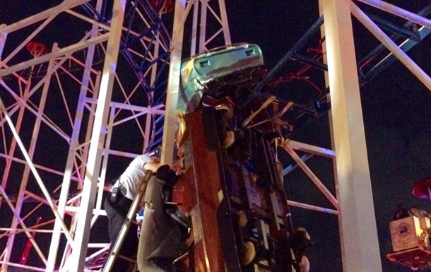Еще два человека застряли внутри одной из машинок, повисшей на креплениях, пожарные провели операцию по их спасению, которая продлилась около 30 минут.